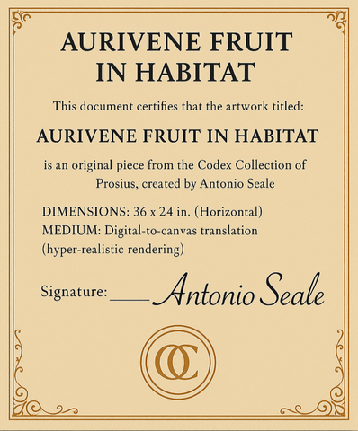 The Aurivene Fruit in Habitat is more than an artwork it is a window into the interdimensional natural history of the Codex of Prosius. Rendered in hyper realistic detail, this piece captures the Aurivene fruit vine at full resonance, bathed in the subtle atmospheric energies of its native crystalline habitat.