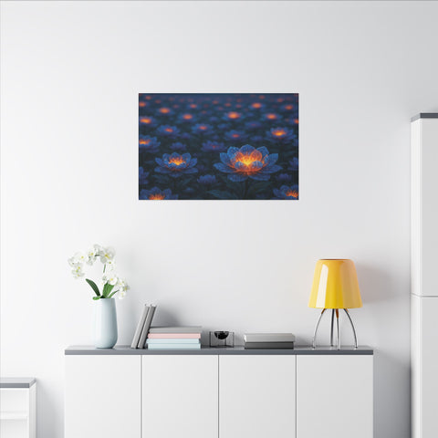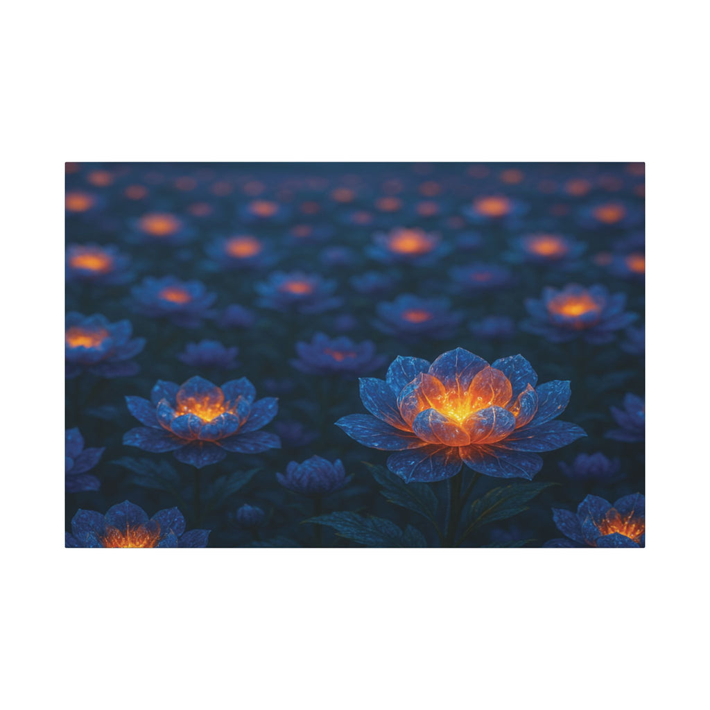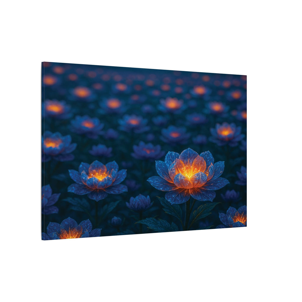 The Glucorus Fields capture the breathtaking expanse of these metaphysical flowers as they ripple across the plains of Prosius. Each bloom glows with an ember like heart, creating waves of sapphire and flame that resonate with deep frequencies of transmutation. In the Codex, this spectacle is said to cleanse entire regions of stagnant emotional resonance, ushering in a cycle of rebirth and clarity. The sight is both grounding and ethereal, a reminder of the collective power of renewal.